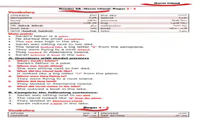 مذكرة اسئلة واجابات على قصة جزيرة العاصفة او Storm Island المقررة