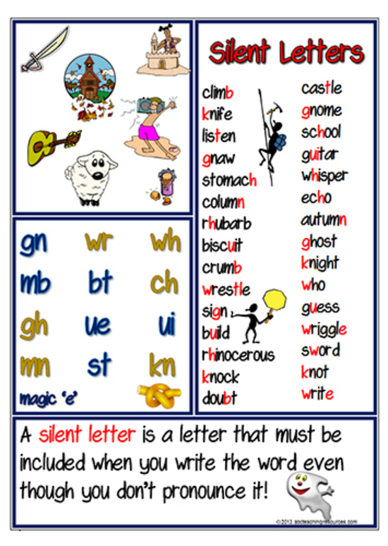 جميع كلمات الحروف الصامتة Silent Letters في أربعة أوراق احفظهم