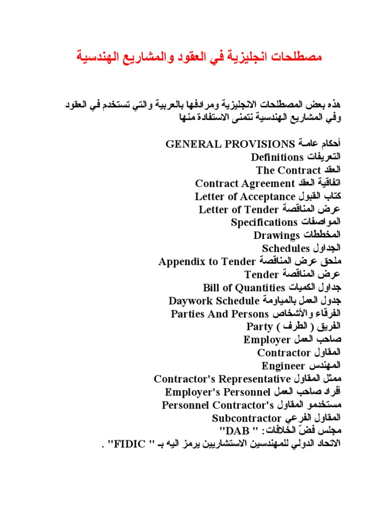 مصطلحات انجليزية في العقود والمشاريع الهندسية